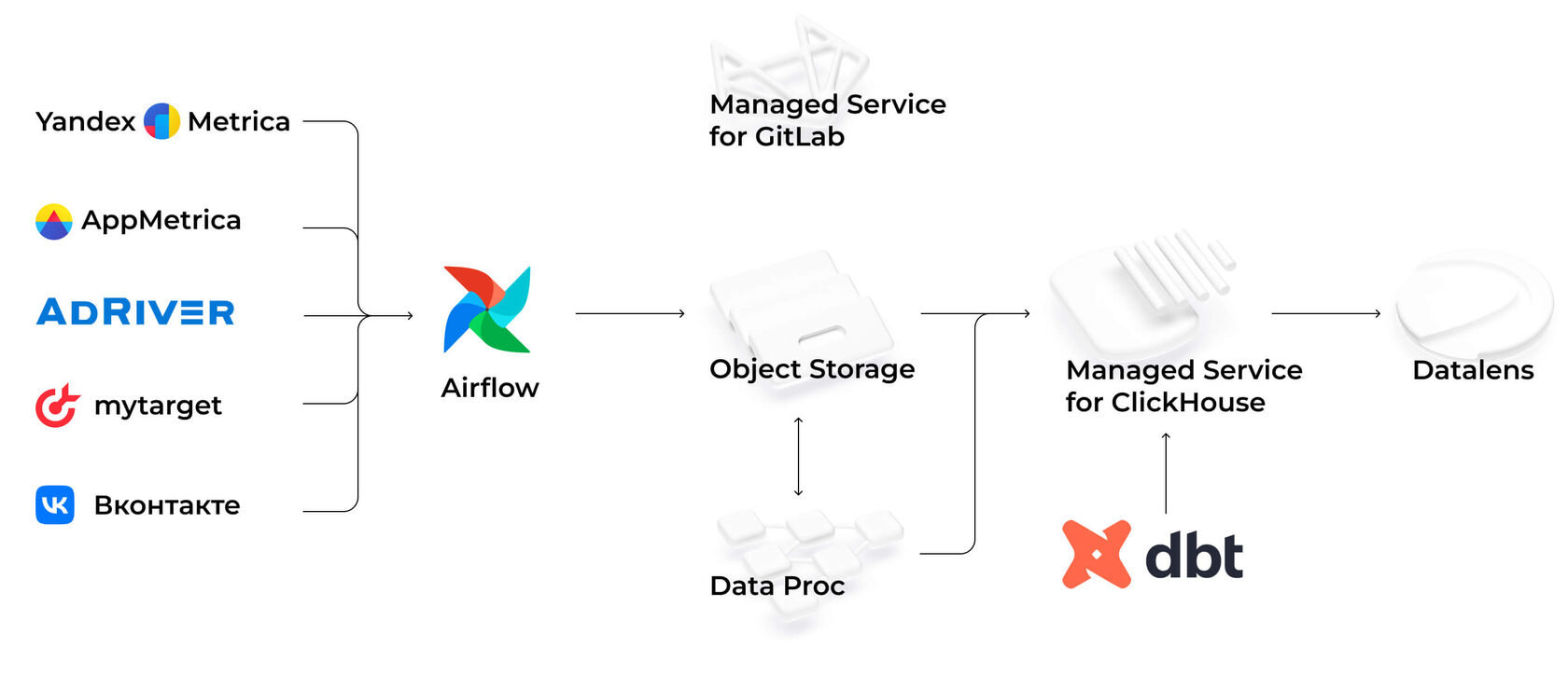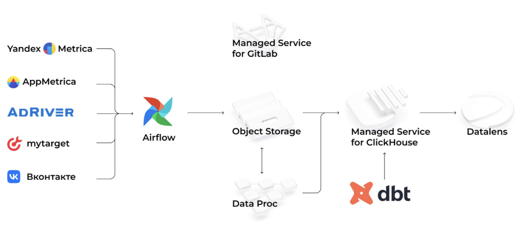 Ориентируясь на запросы клиентов, мы разработали пайплайн для переноса аналитических систем с других платформ и их развёртывания в Yandex Cloud на базе сервисов платформы данных Object Storage, Data Proc и Yandex Managed Service for ClickHouse с визуализацией данных в Yandex DataLens.